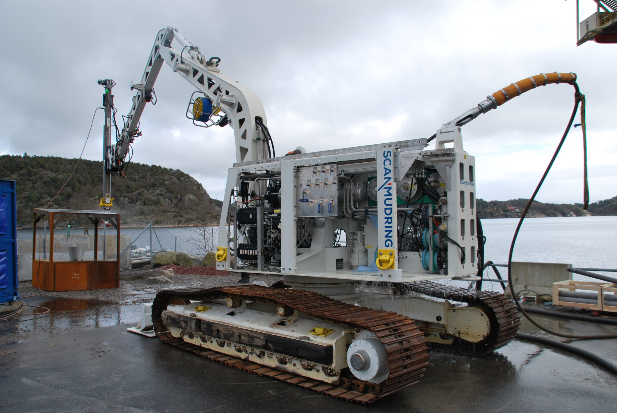 Scanmudring has invested in various drilling rigs to mount on our Scanmachines. The drilling rigs can drill holes up to 203 mm (up to 324 mm option) and 13 meters depth. The drilled holes can be cased or left as an open hole and then bolted for anchoring or for inserting rock splitters. Drilling time varies based on access to drill location, but typically 2-10 minutes drilling time per site. The lightweight aluminium mast is free rotating 360 degrees and can tilt 0-90 degrees. The drilling unit requires high-pressure water (445l/min @ 180 bar). The same drilling unit can also make core samples (103 mm core @ 2,3 m length) on uneven surfaces. A dedicated suction feature integrated with the drilling mast remove drilling materials from the hole. The Scanmachine can insert the bolts, and insert grout/epoxy for permanent fastening or rock splitting.